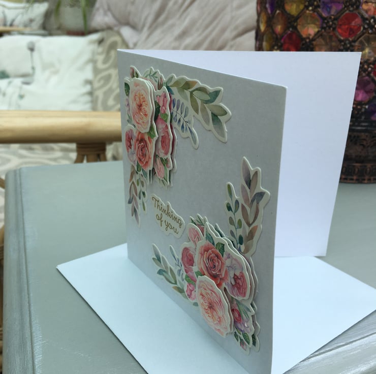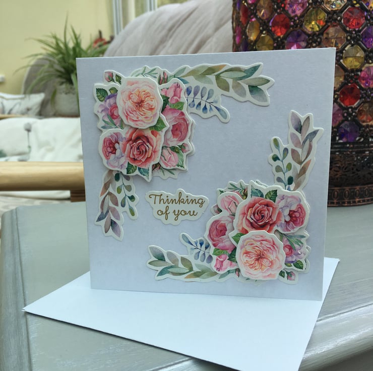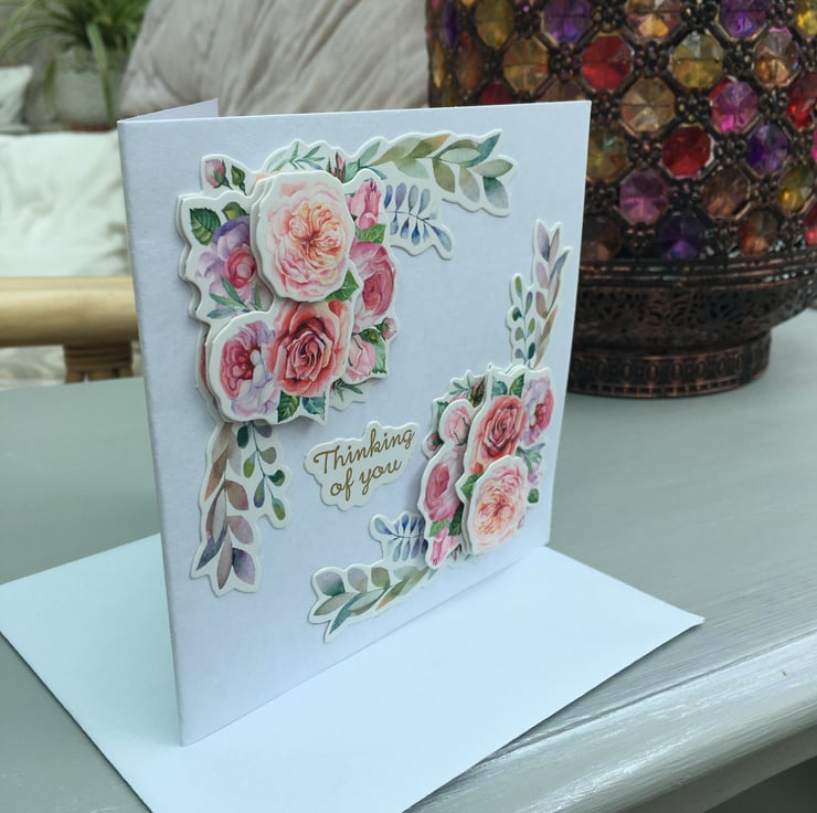 A simple and elegant card to send your thoughts and sympathies to someone. This pale blue square card has multilayered floral corner details. They delicately surroung the wording which is Thinking of you. This versatile card can be used for sympathy or just to send kind thoughts to someone. Old English roses and foliage make this a pretty and elegant card. The inside is blank for your own message and it comes with a matching blue handmade envelope.