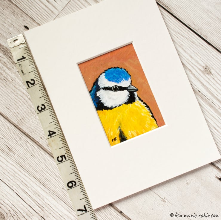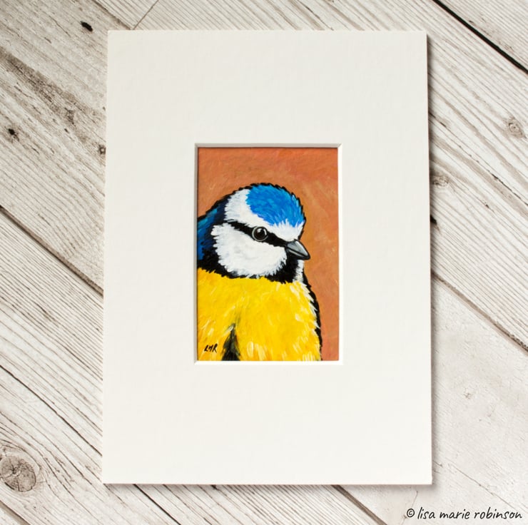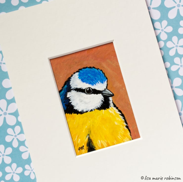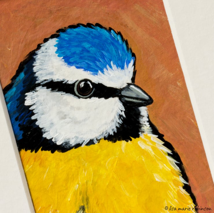 An original small acrylic painting of a happy little blue tit. With their striking blue and white heads and yellow chest plumage, these birds always bring cheer to the garden on the darkest of days.