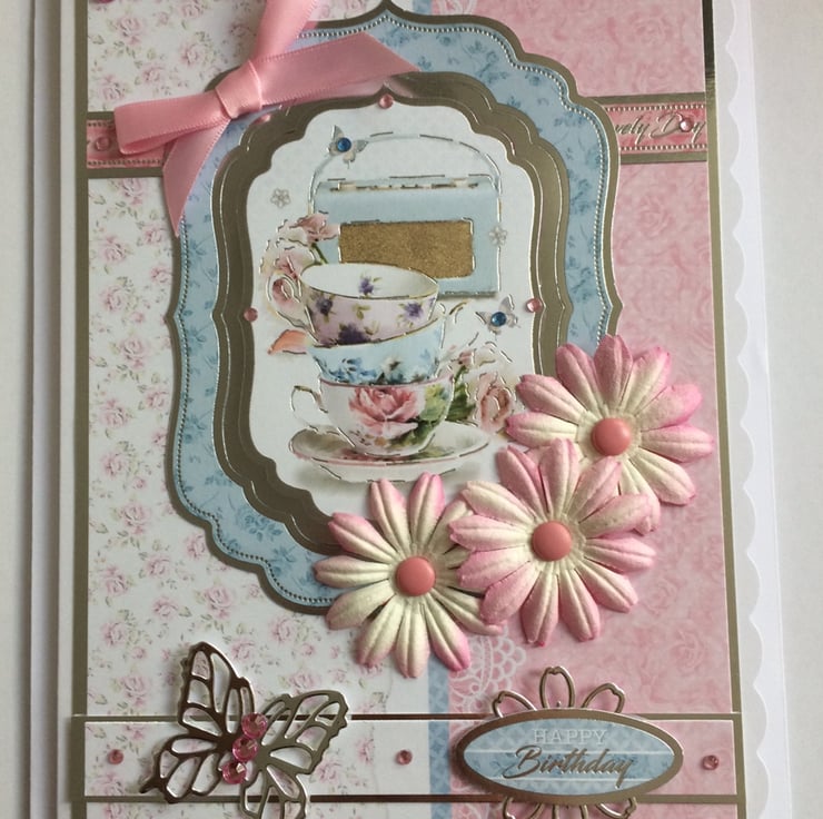 This is a lovely luxury 3D handmade greeting card to send to that special person in your life. The design is a stack of vintage china teacups with traditional floral patterns next to a vintage radio. The 3D greeting is silver foiled and says "Happy Birthday".