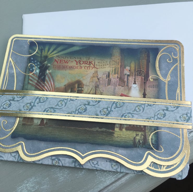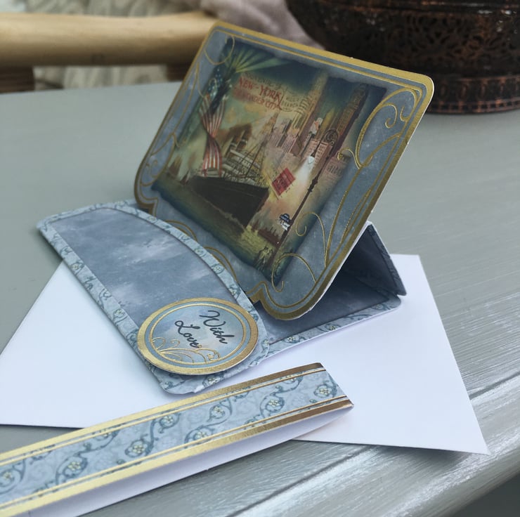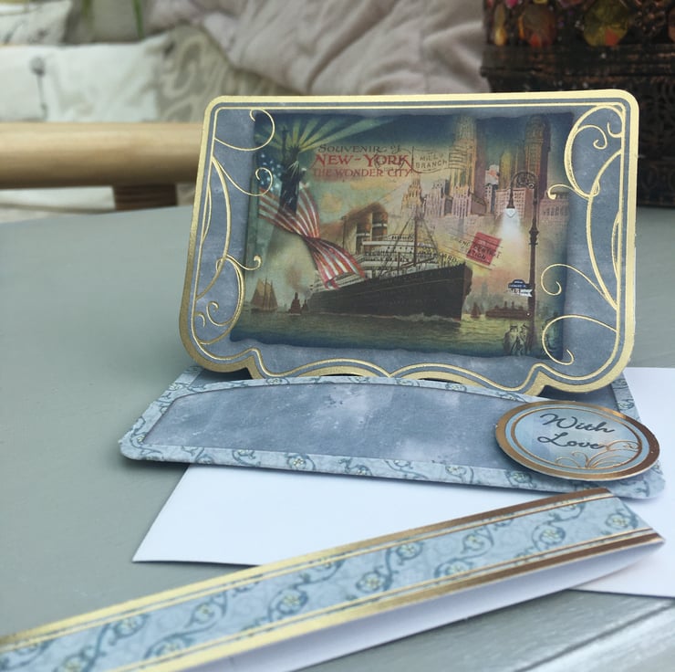 A little bit of New York nostalgia. A small card that doubles up as a gift card holder. This easel card has a vintage image of New York harbour with an ocean liner steaming it's way across. The card is gold edged and has a pocket for a gift card or certificate. The whole card is kept together with a matching belly band. It comes with a matching envelope. The greeting says With love. This versatile card allows you to send a gift or even money for many occations, birthday, bon voyage, anniversary, wedding or honeymoon in a classy way.