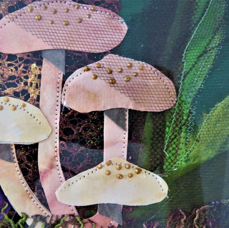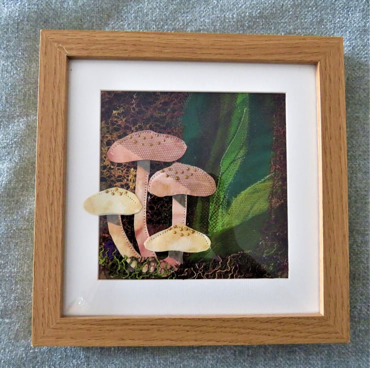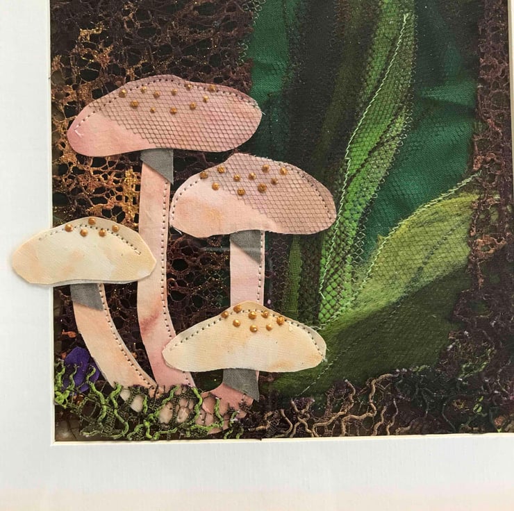 The picture is created by strips and shapes of fabric, layered and machine stitched. The toadstools are painted cotton fabric and over spill onto the mount for interesting detail.