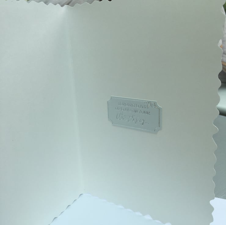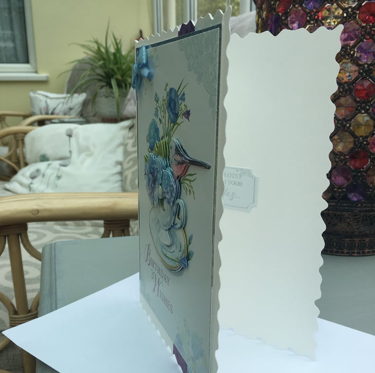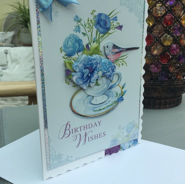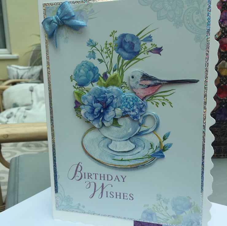 A lovely decoupaged card to celebrate a birthday. A teacup adorns this card eith a lovely bouquet of blue flowers bursting out of it, a little bird sits on the flowers to finish the design. This card would be lovely for a Mum or Grandmother, sophisticated and elegant. The card has the greeting Birthday wishes and is finished with a sparkly bow. The design is mounted on holographic card to add a little sparkle and the card has a deckle edge to it. Inside says Sending you lots of love on your birthday in silver.