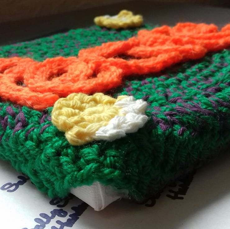 Wall art created from crocheted cotton and acrylic yarn on a square canvas frame