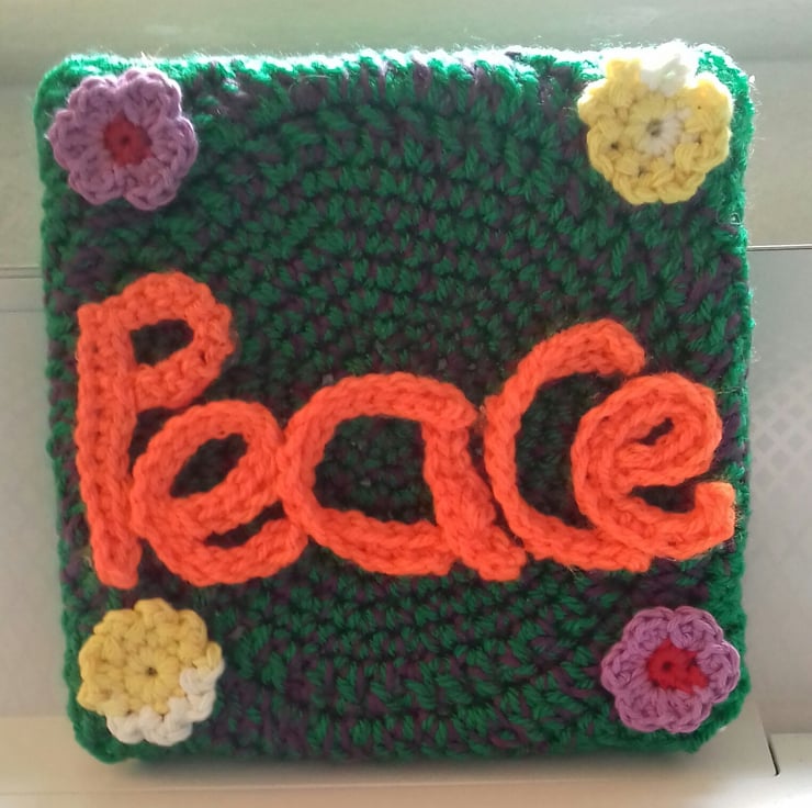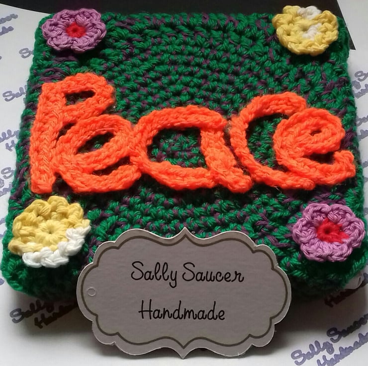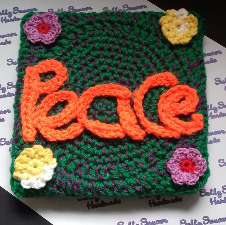 Green and purple background, 2 purple flowers and 2 yellow & white flowers. The word "Peace" is in a bright neon orange.