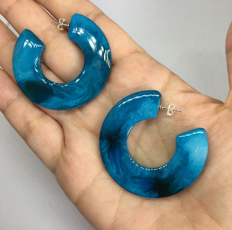 Your large statement hoop earrings will be similar to the ones in the photo but as each pair is handmade no two pairs will ever be identical as the resin and alcohol inks react together and create unique patterns every time.
