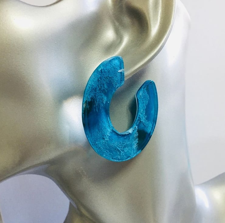 Sale, Turquoise blue-green semi circle large hoop statement earrings. One of a kind resin and ink large hoop earrings these are a gorgeous blue-green colour in real life depending on your screens colours can appear different.