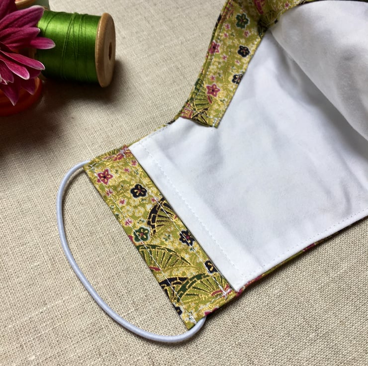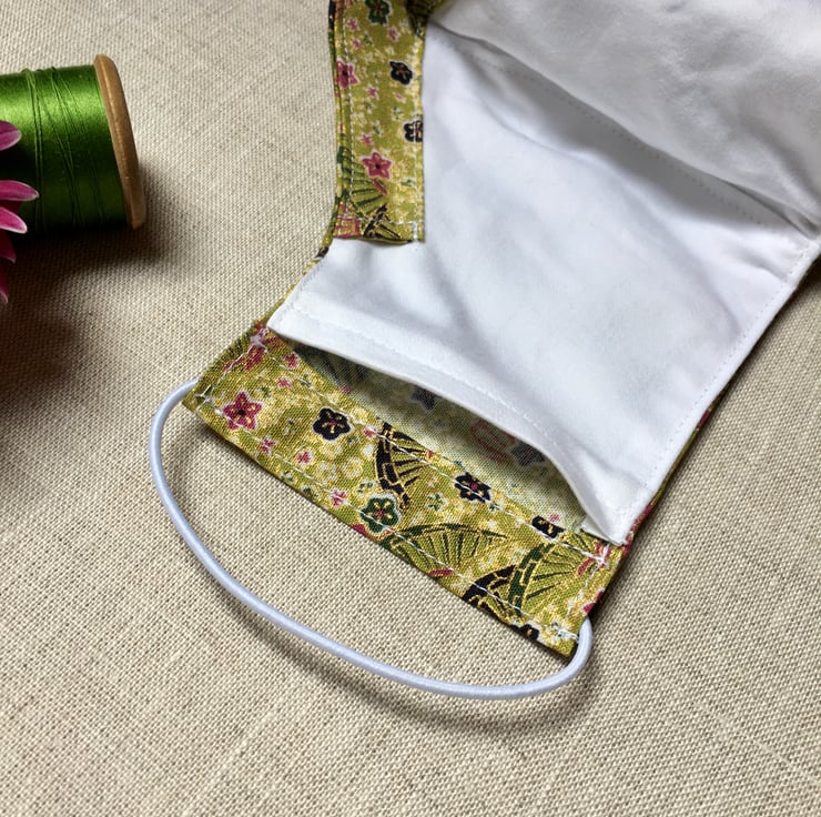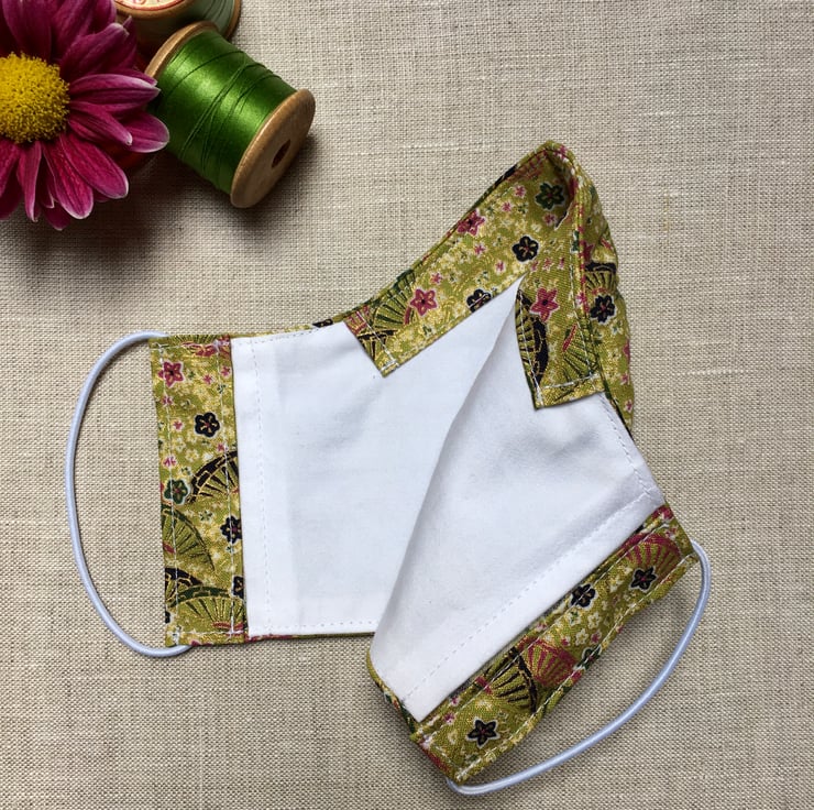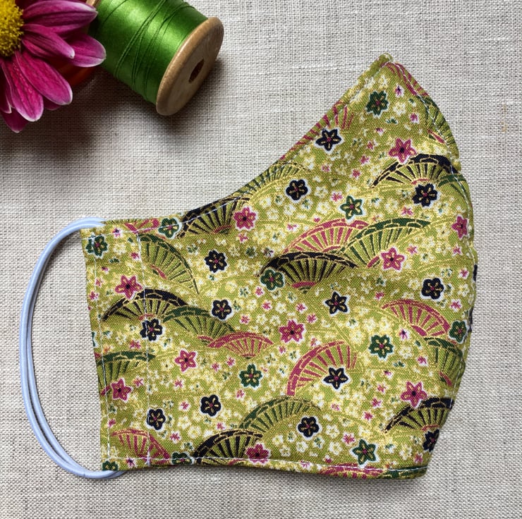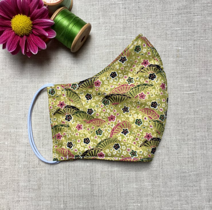 A gorgeous gilded Japanese fabric in a light green with contrasting coloured fans and flowers has been used to create this face mask. The fabric is high quality cotton and has been lined with at least a 400 thread count cotton, which is soft against the skin. The mask is washable & reusable.