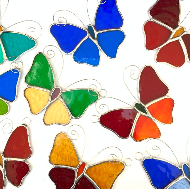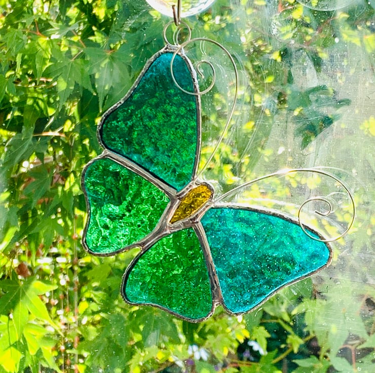 The butterfly measures 11 cms across by 9 cms excluding antenna. This would be lovely hanging in any window or even on a mirror, and they look especially good if hung in pairs or more. Did you know the collective noun for a group of butterflies is a kaleidoscope?