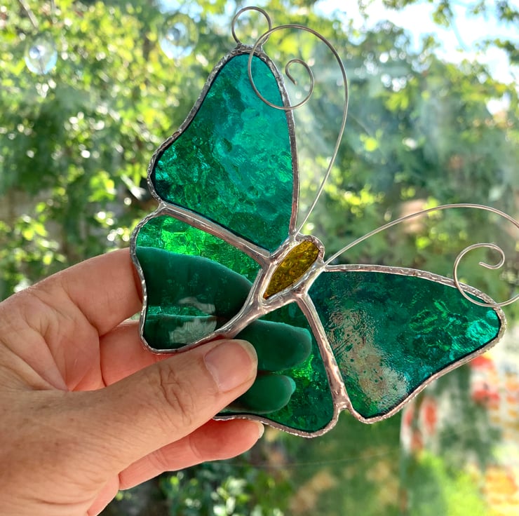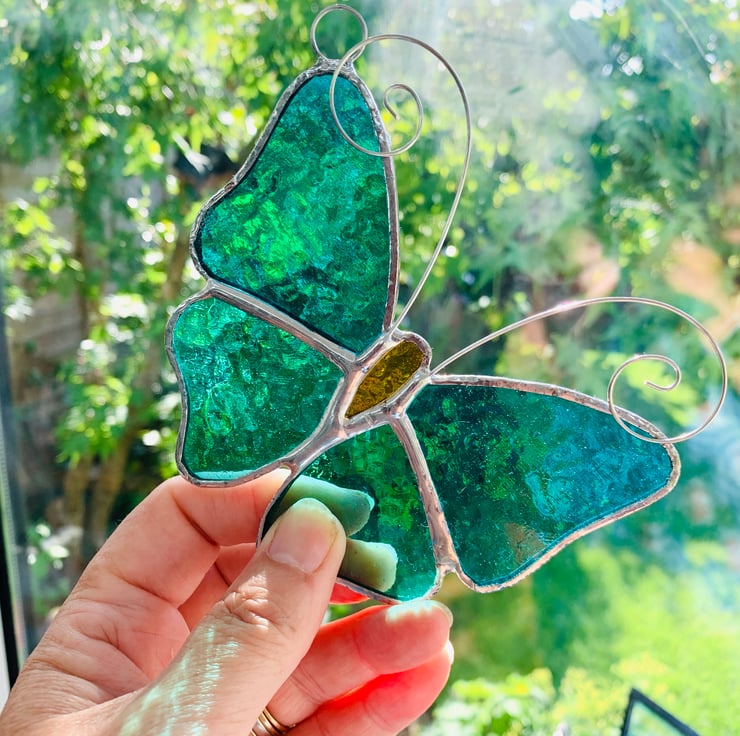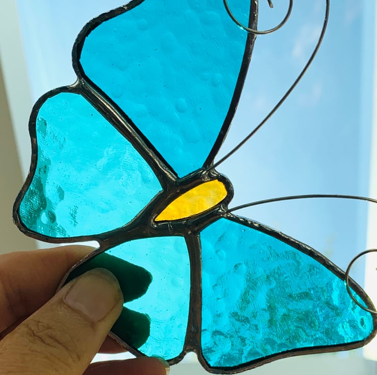 This stained glass butterfly has been made from pale aquamarine, and aquamarine corella glass for the wings and amber streaky textured glass for the body.
