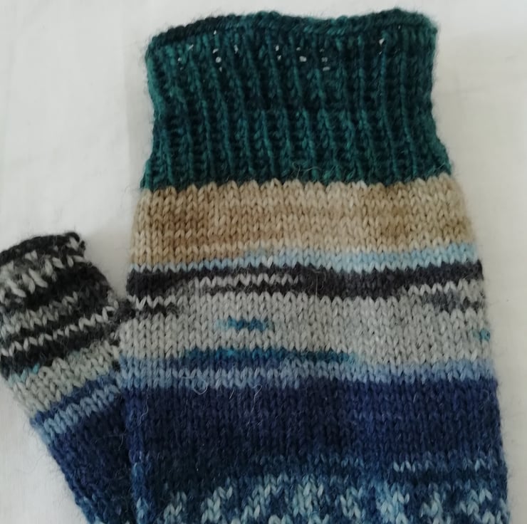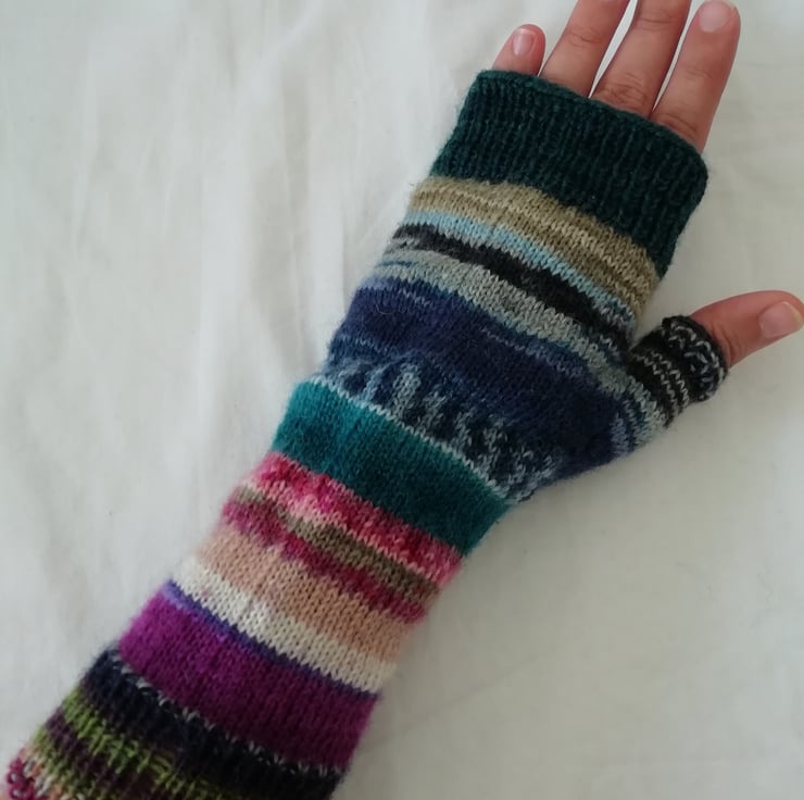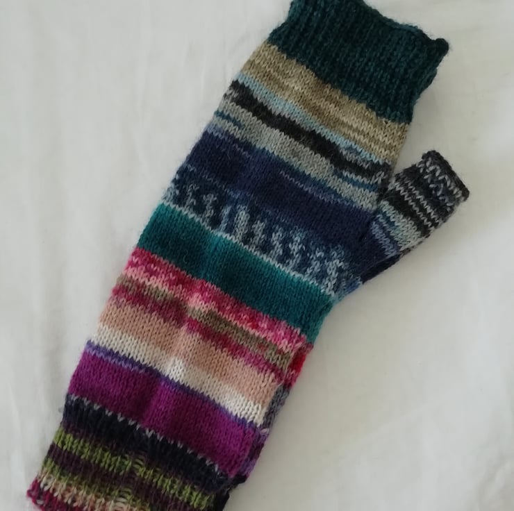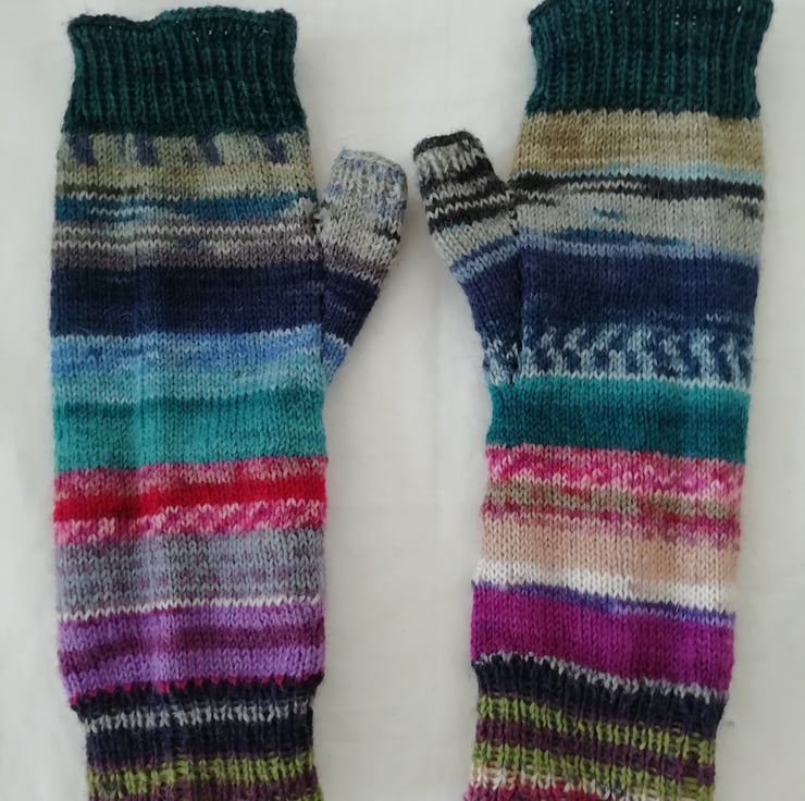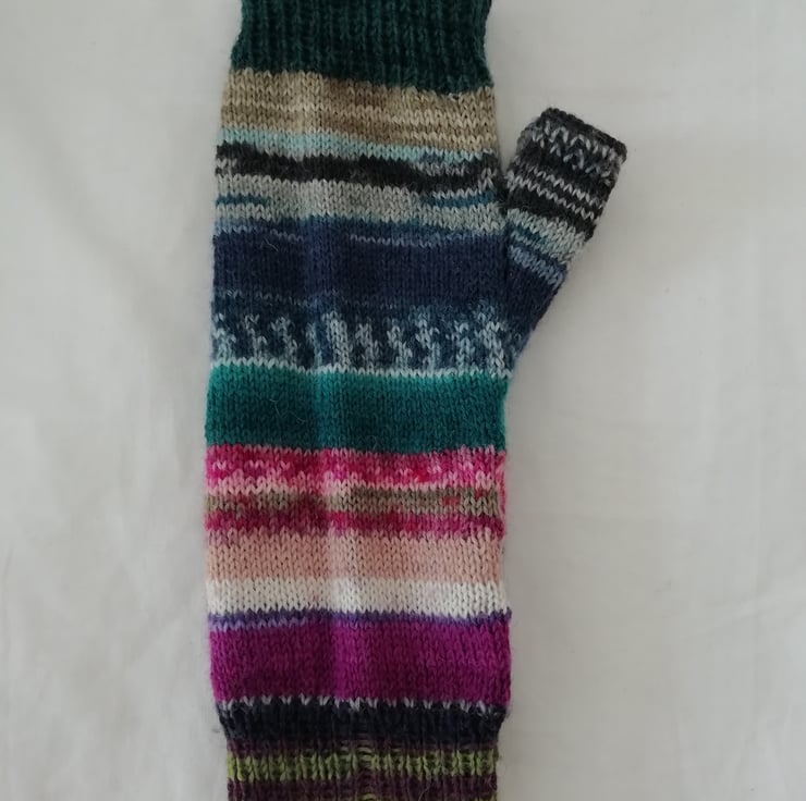 Hand knitted wool fingerless gloves made using a durable and comfortable 4 ply yarn comprising of 75% wool and 25% polyamide ensuring comfort and strength. The colours are a unique and bright mixture of pink, purple and blue tones. Perfect for cooler days, the fingerless design allows you to still get things done without being restricted. This pair of gloves has been knitted in a traditional method using 4 double pointed needles, allowing for a comfortable finish with no bulky seams.