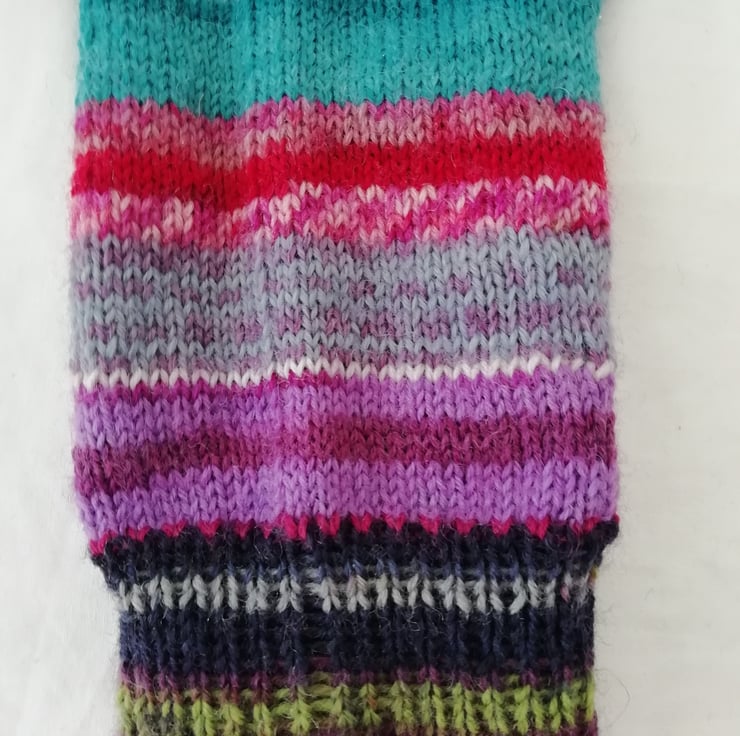 This pair has been knitted using a range of yarns to create a colourful and random effect, therefore the pair are not an identical match, which is the desired effect.