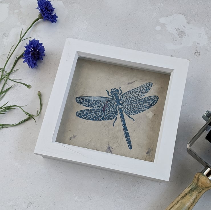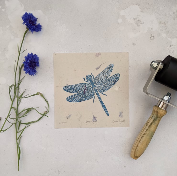 Fossils of giant dragonflies have been found that date back 325 million years ago, so they have been around for a very long time indeed. In Japan they are seen as symbols of strength, courage and happiness. I have titled this print "Strength" in honour of this idea, but also because it was created during the Covid 19 lockdown period, and I feel we could all do with at little strength at that times.