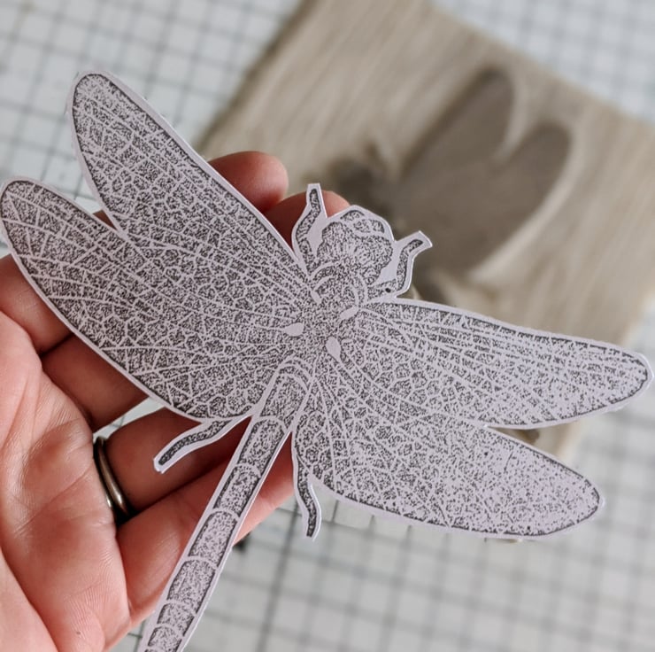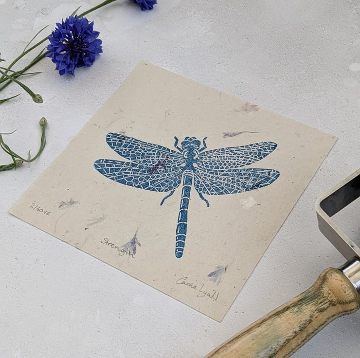 Dragonfly limited edition linocut print titled "Strength". Edition of 60.