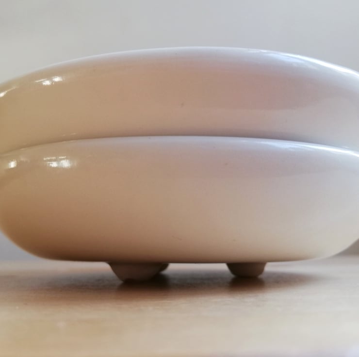 Hand made pottery soap holder in pure white stoneware clay with clear glossy glaze, little feet dot drainage hole.