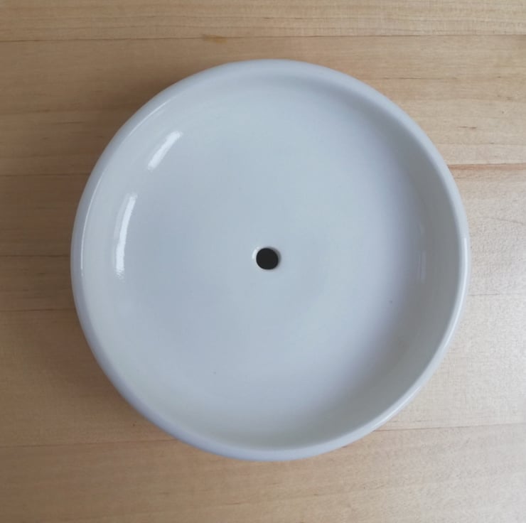 Hand thrown off the hump on my potter's wheel and altered to make cut out hole for drainage and little feet so no more soggy soap. Once bisque fired glaze was applied prior to the second firing.