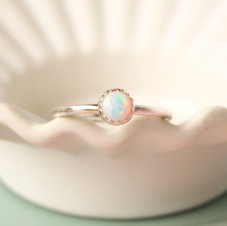 A shimmery White Lab Opal carefully set by hand onto a band of Sterling Silver. The stone is a round cabochon cut measuring 5mm, white in colour with lots of flash - the term given to the colour sparkle an opal produces that makes them so special. The ring is simple in design on a fully round band 1.5mm diameter. The setting has a zig zag edge which gives it a nice detail.