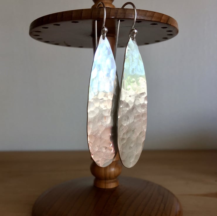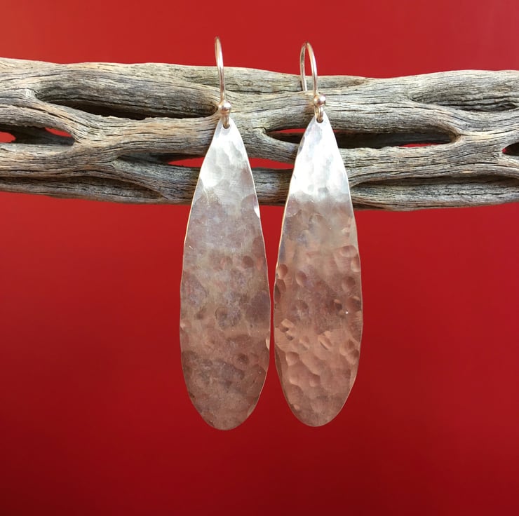 I have hammered these hand-cut sterling silver earrings to give them some texture, which catches the eye as light falls on the silver. They are long and striking - the kind of earrings that can dress up an outfit but also look could with a simple t-shirt.