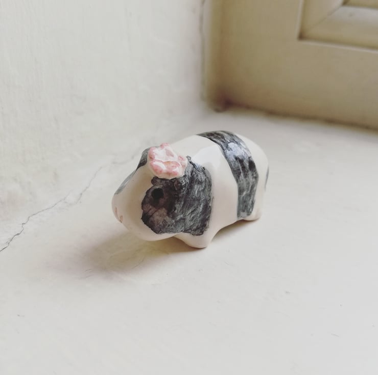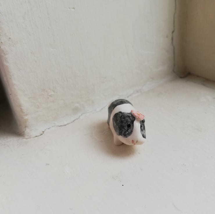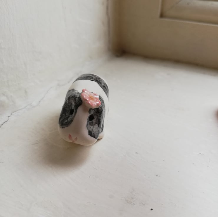 Hand made guinea pig sculpture in black and white with a pink primrose - a little pocket pet friend for piggie lover .