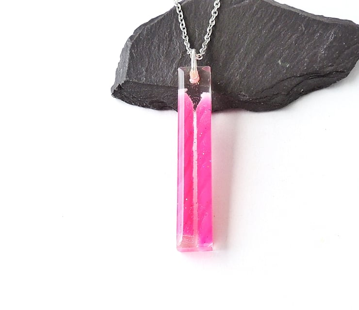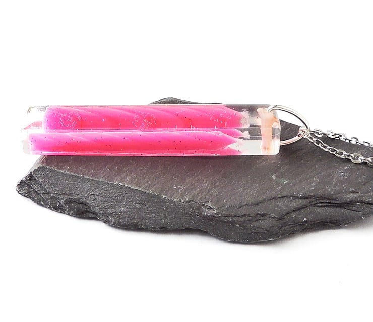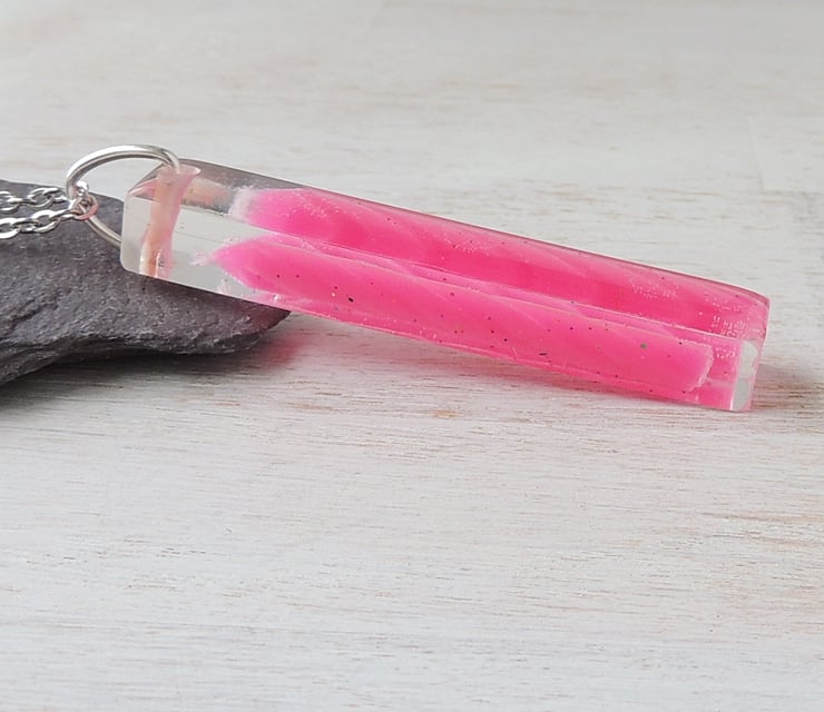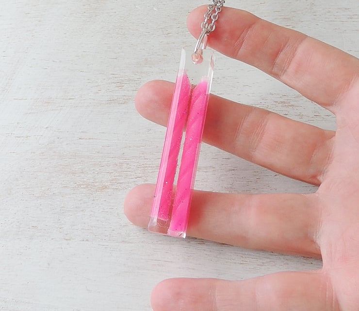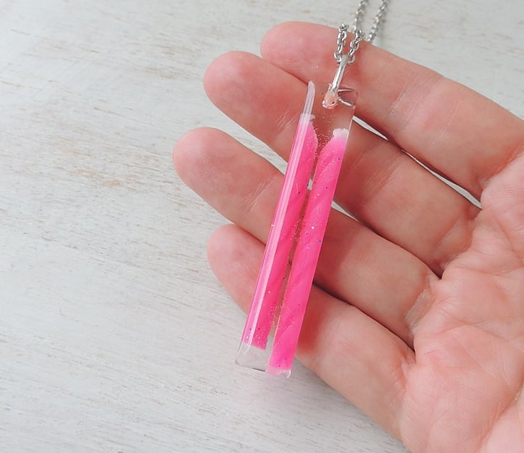 This fun and quirky necklace has two pink birthday cake candles captured in a resin pendant.