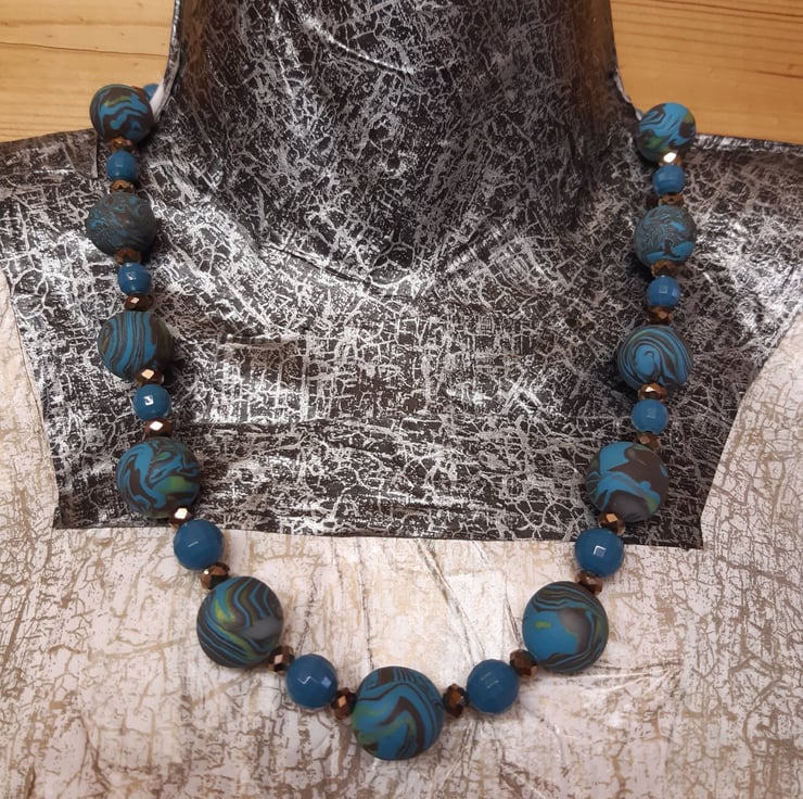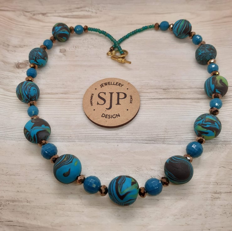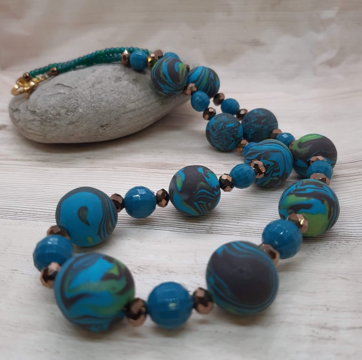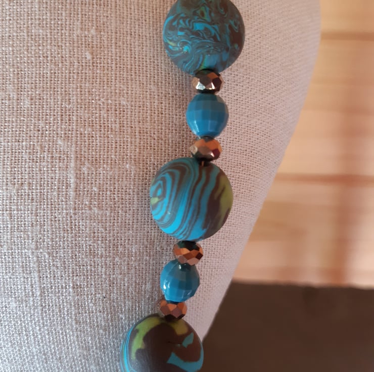 A colourful necklace in a combination of teal, brown and lime green polymer clay. The largest handmade bead is approx 16mm, the smaller ones are approx 14mm interspersed with shimmery brown faceted beads and turquoise recycled beads.