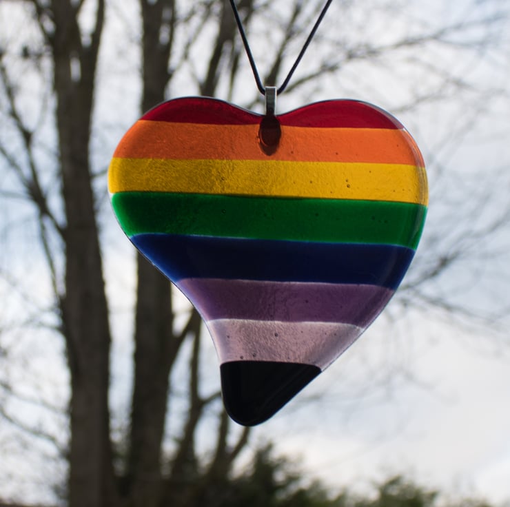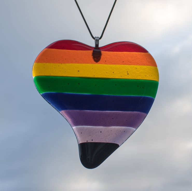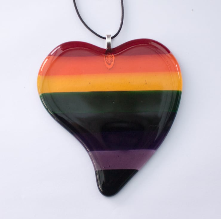 The heart is made from 9 pieces of transparent glass, each of which is hand-cut and shaped to form one of the stripes. They are laid out on a separate piece of clear glass which has been cut and shaped to cover the stripes. The glass is fired in the kiln, following a programmed cycle of heating and cooling to form a single piece of heart-shaped glass. Once cooled we glue on the bail and thread the faux leather cord from which it hangs.