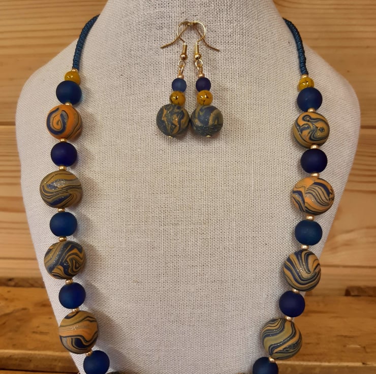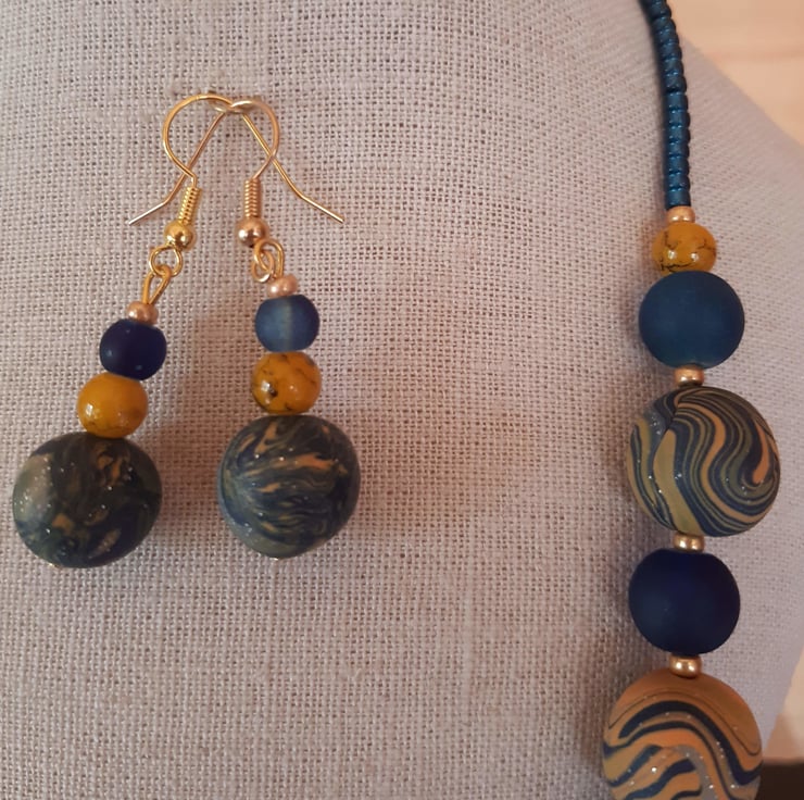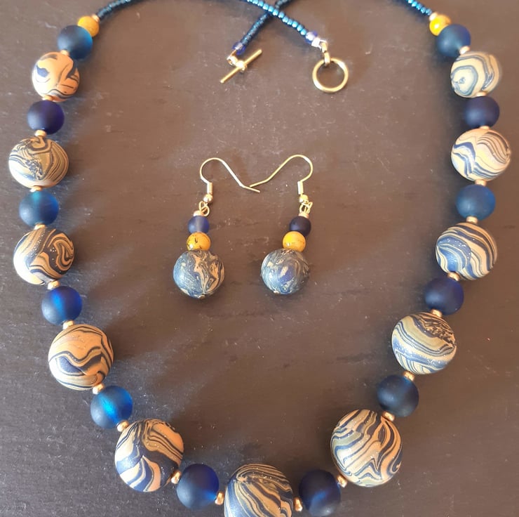 Handmade from polymer clay this original necklace features a combination of 11 mustard yellow and navy beads between 13 and 17mm interspersed with 10mm navy glass beads and gold plated spacers. Finished with navy seed beads the overall length of this necklace measures 53cm/21 inches complete with gold plated toggle.
