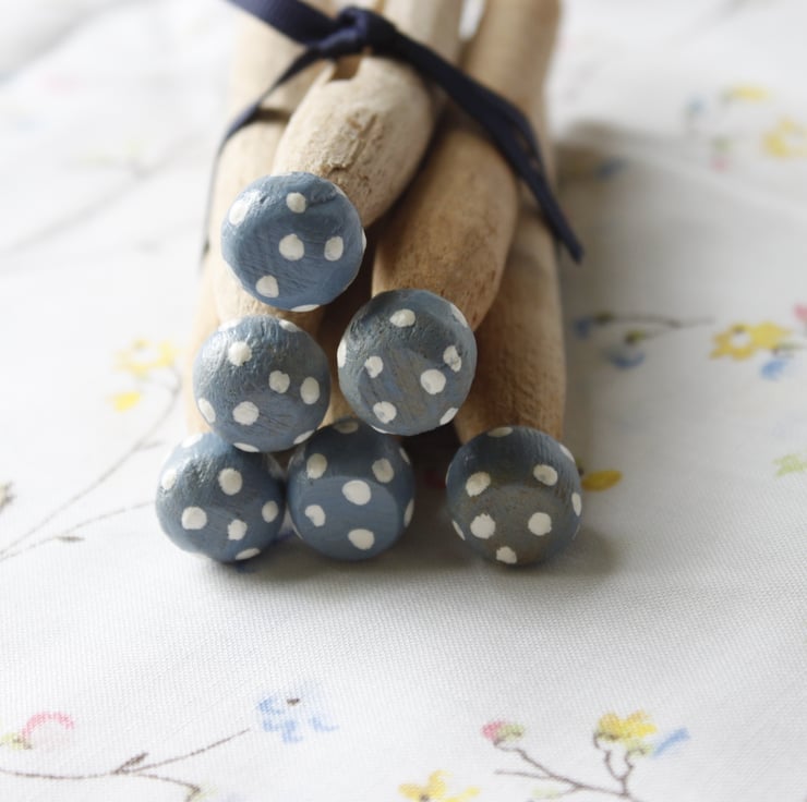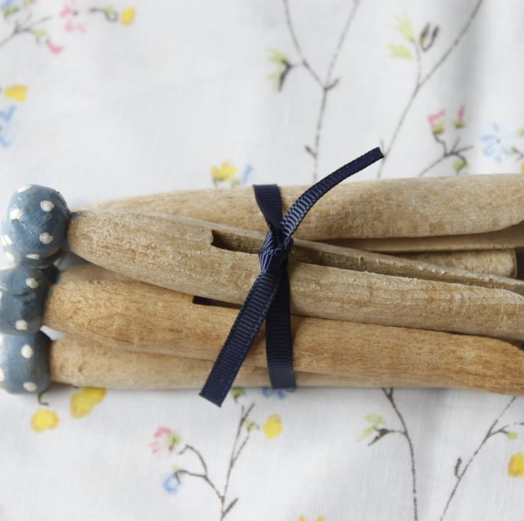 A set of 6 vintage dolly pegs, hand painted by me, with blue ends and white spots. Really useful for holding notes, storing threads and, of course, livening up the washing line!