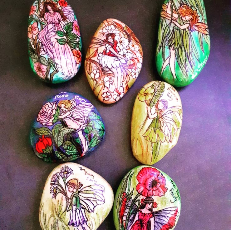 This is a lovely handpainted Flower Fairy beach rock ...possibly my favourite as I love weeping willow trees ....this beach rock was picked from Fistral beach in Newquay Cornwall .. it measures approx 4 and half ins long and 2 and half ins wide at its widest point ...the Willow Fairy.has been hand painted in acrylics and inks and the rock.has been well protected with several layers of waterproof varnish ....it is suitable for inside or outside in a sheltered space...just bear in mind it will be subject to adverse weather conditions if out in the open and I wouldn't advice it to be immersed in.water for any length of time ...this rock.would make a unique decorative paperweight ...home decor and garden decor or just nice to keep.as an original piece of art ...and great for those who love fairies or flowers ...or both ! It will be titled and I will sign the reverse