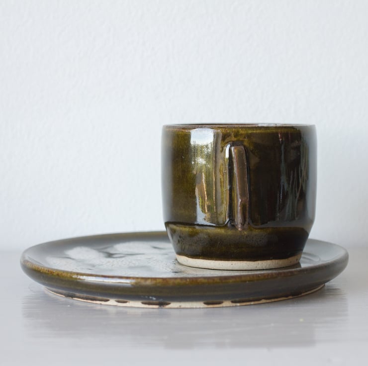 Both cup and saucer were thrown by hand on the pottery wheel. The small straight handle was attached afterwards before the first firing in the kiln. It is small but still comfy enough to hold for such a small volume of coffee. The cup sits off centre on the saucer allowing room for a little treat.