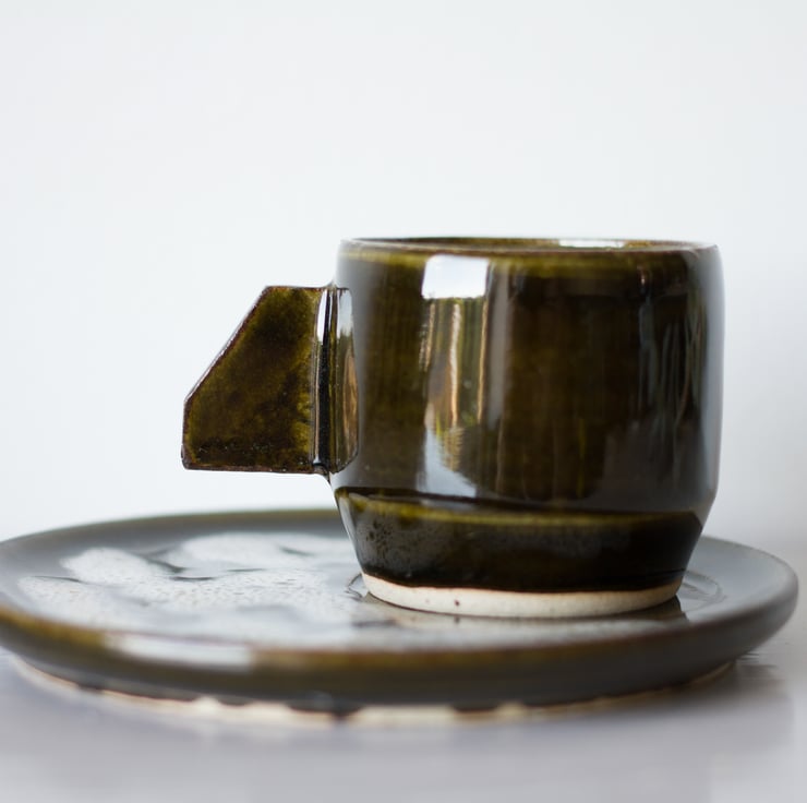 Small dark green and white espresso cup with straight handle and accompanying off-centre saucer.