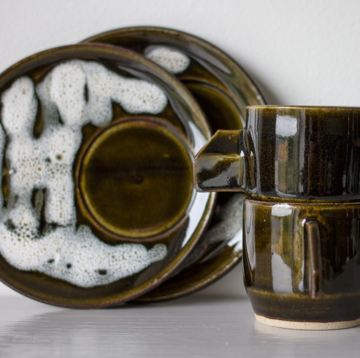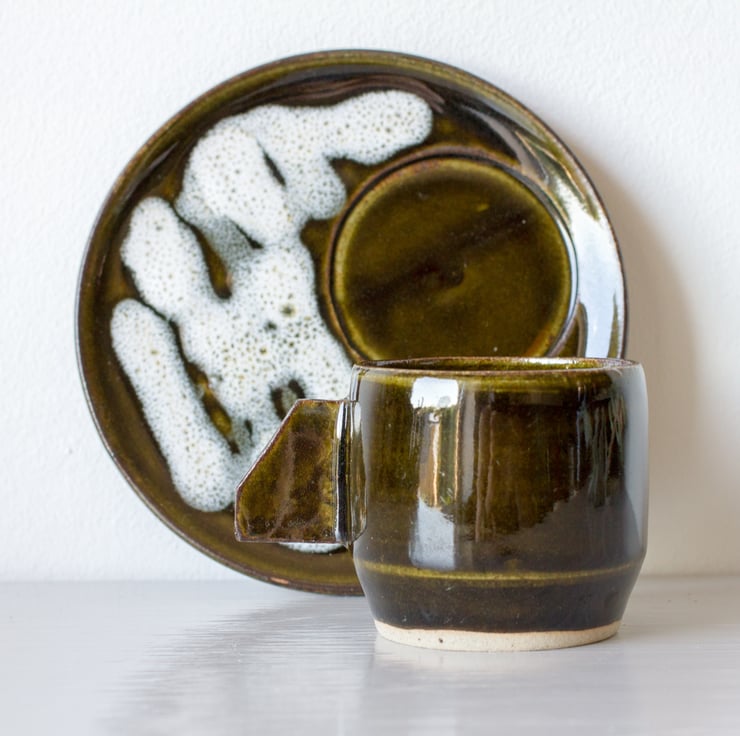The saucer is dark green with white glaze dribbled over it which has fired to give a foam like appearance.
