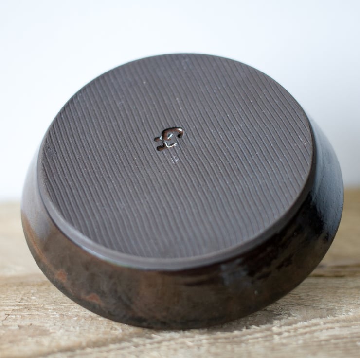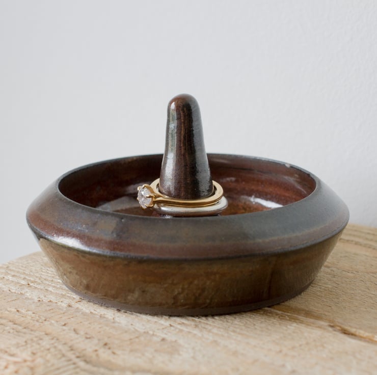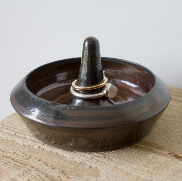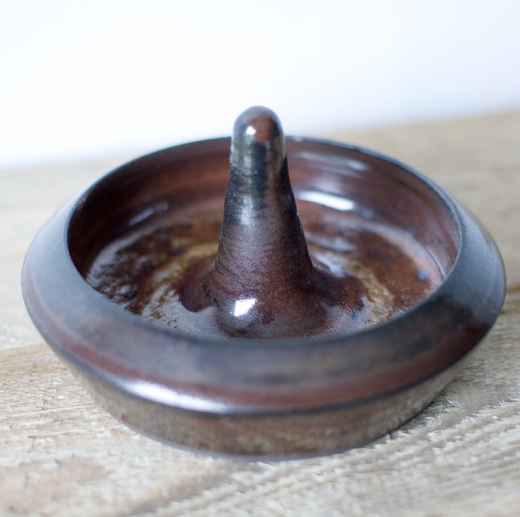 Ceramic ring holder made from black clay with a brick red/brown glaze. Ideal for putting your rings and other small jewellery at the end of the day ready for wearing the next day or to be transferred to your jewellery box.