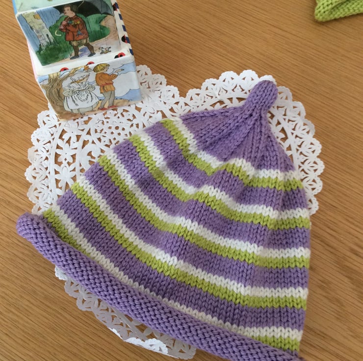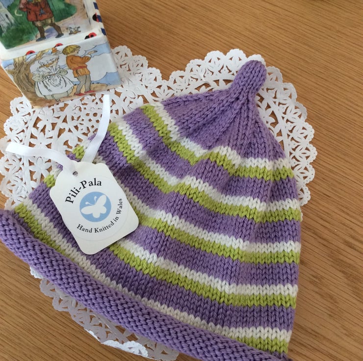 This soft little hat was hand knitted by me. It is knitted in a cashmere blend wool that is soft for babies but can also be machine washed at 30 degrees.