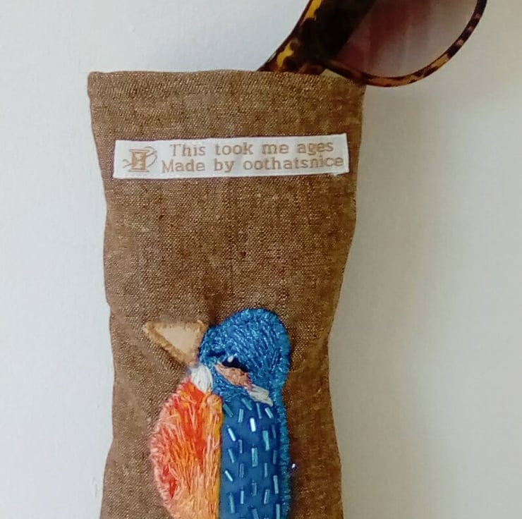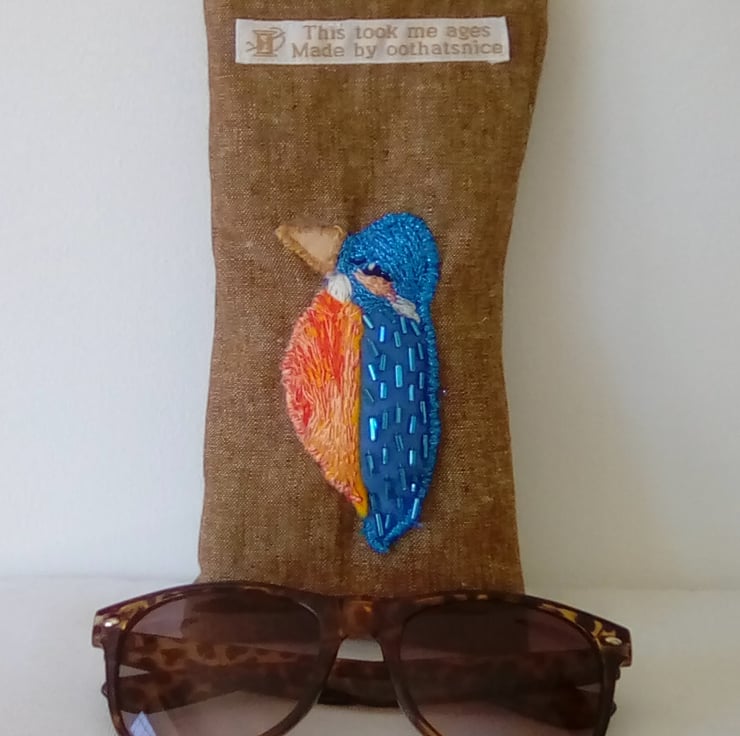 I have hand embroidered this Kingfisher, then covered various areas with beads. Made from 100% natural linen with a tight even weave. The case is also lined in Orange cotton and padded with wadding. It fastens with a metal clasp to keep your glasses safe.