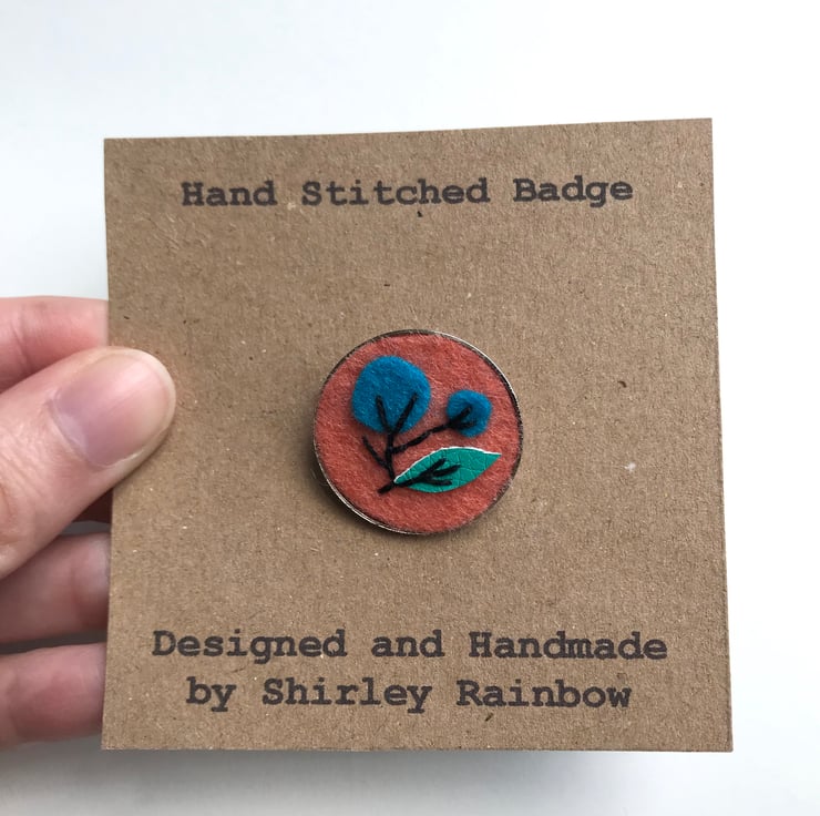 The badge is hand stitched on 100% wool felt using cotton perle thread. The felt is all cut by hand, which makes each piece unique. It features tiny sprig with two flowers in blue felt with a faux leather turquoise leaf in a coral felt background. It measures 1.5” by 1.5” or 2.2cm x 2.2cm.