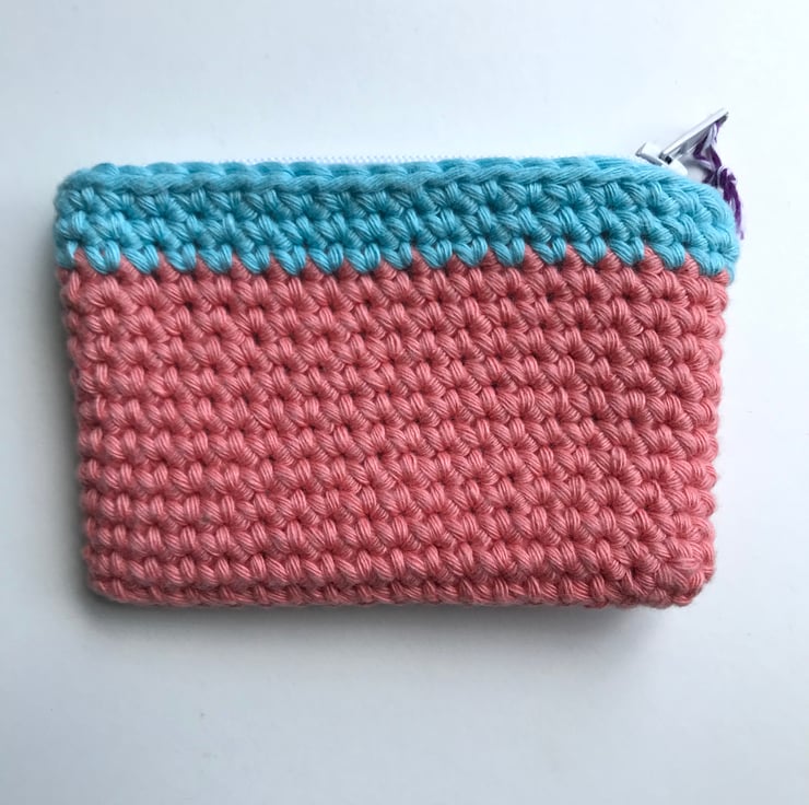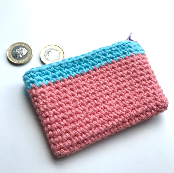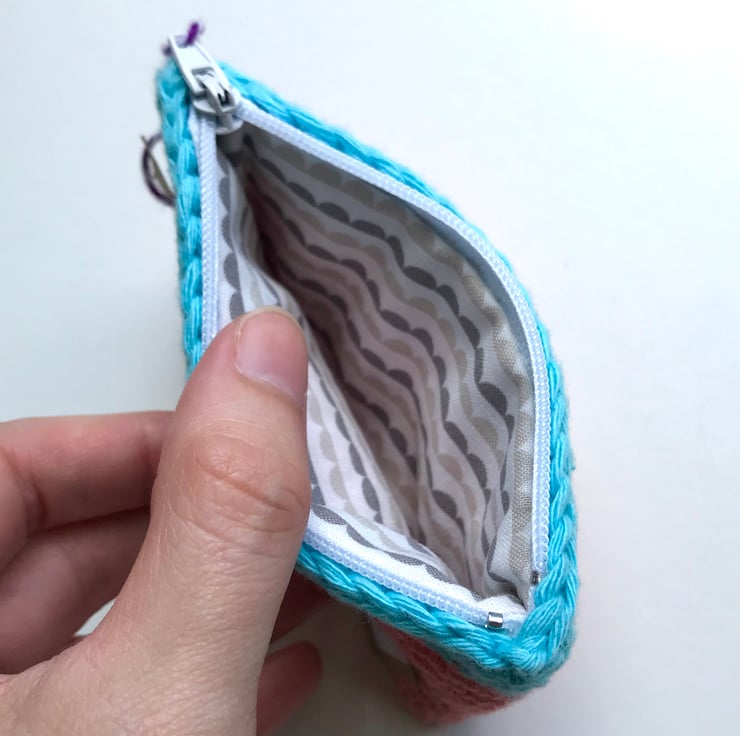 The purse is hand crocheted using thick 100% cotton yarn, lined with printed cotton and finished with a zip. It is made to a pattern by Rosina Northcott of Zeens and Roger, who has kindly given me permission to sell the purses. It measures 10cm /4” by 7.5cm/3”.