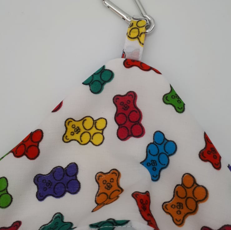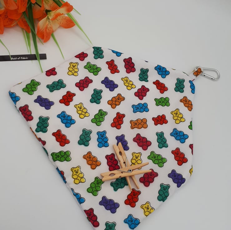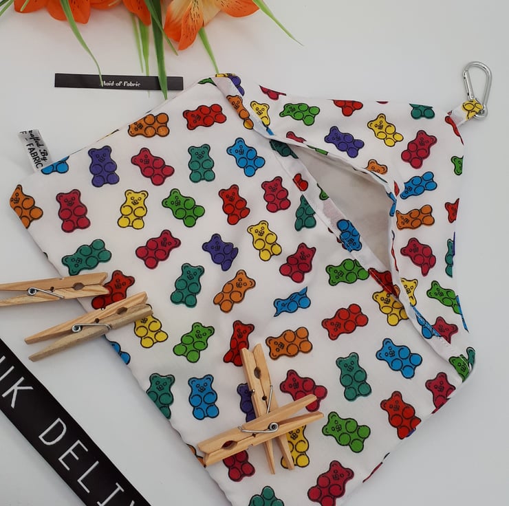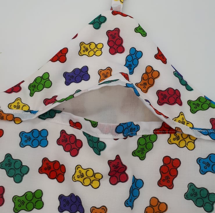 Peg bag made using a colourful gummy bears fabric and white lining.