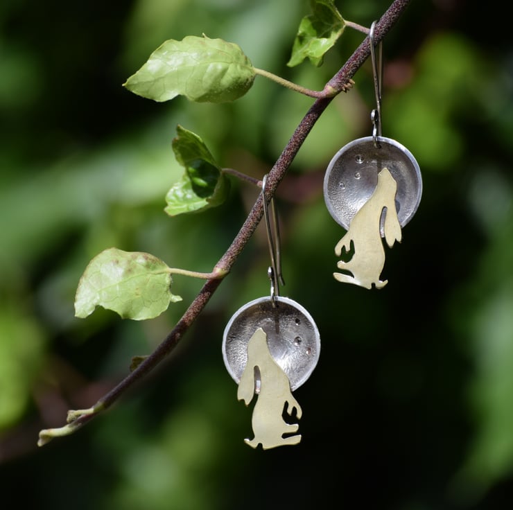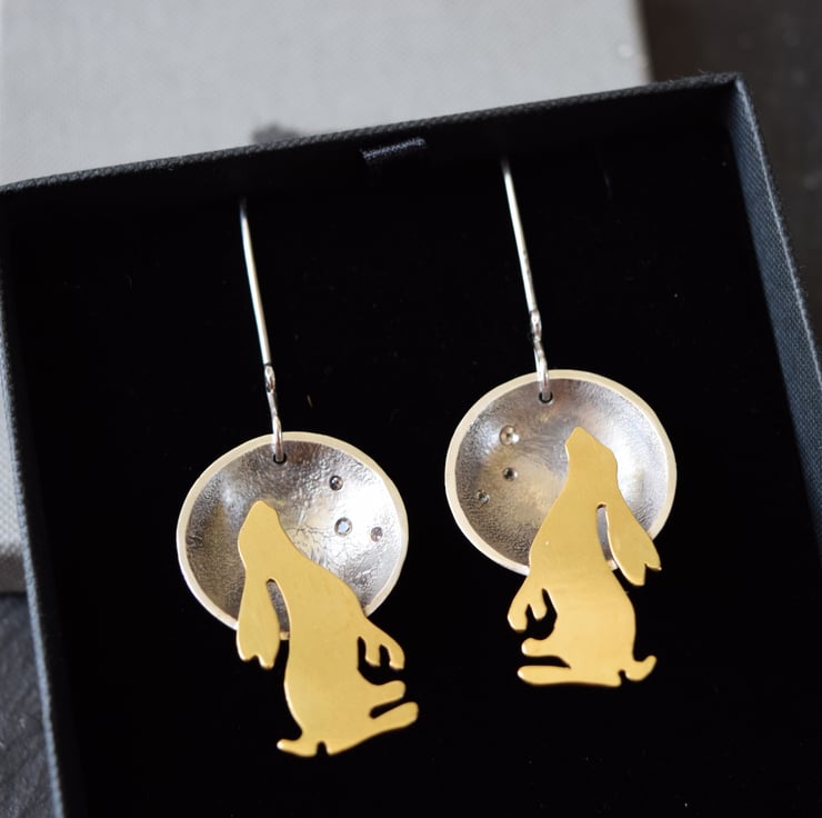 Each hare is individually hand cut from brass sheet and soldered onto silver moons that have been reticulated, domed and set with 3 natural topaz gemstones. The earrings hang from long hand forged silver ear wires.
