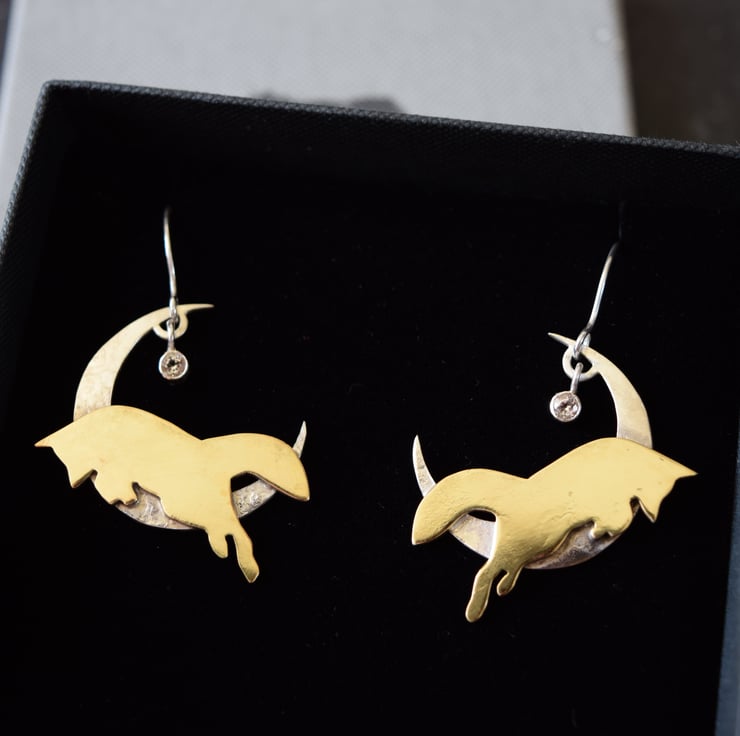 A pair of brass foxes, leaping before a silver crescent moon and bright, shining topaz star.