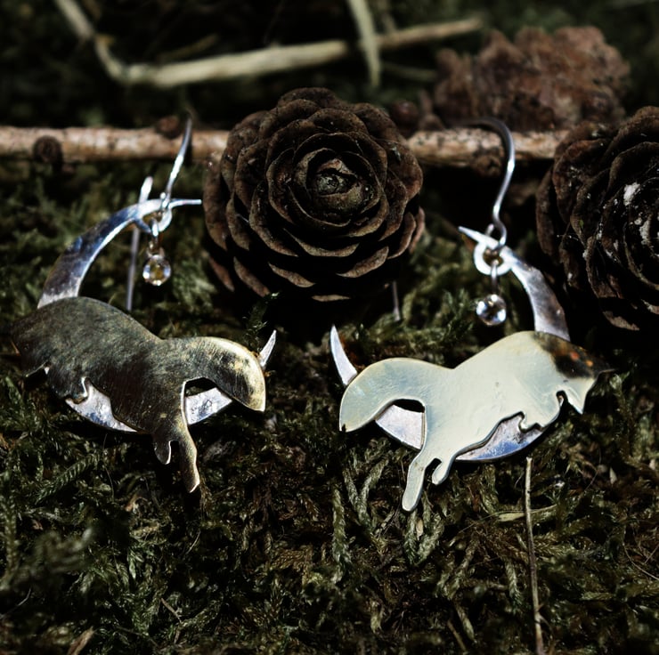 Each fox is individually hand cut from brass sheet and soldered onto silver crescent moons that have been reticulated for texture. A single natural topaz hangs from the tip of each moon. The earrings hang from hand forged silver ear wires.