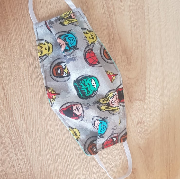 These masks are made out of an avengers printed cotton and have a minty green lining they also have super soft elastic so they wont make your ears sore if you have to wear them all day for school .