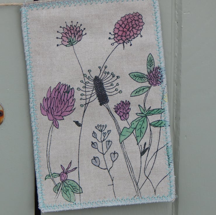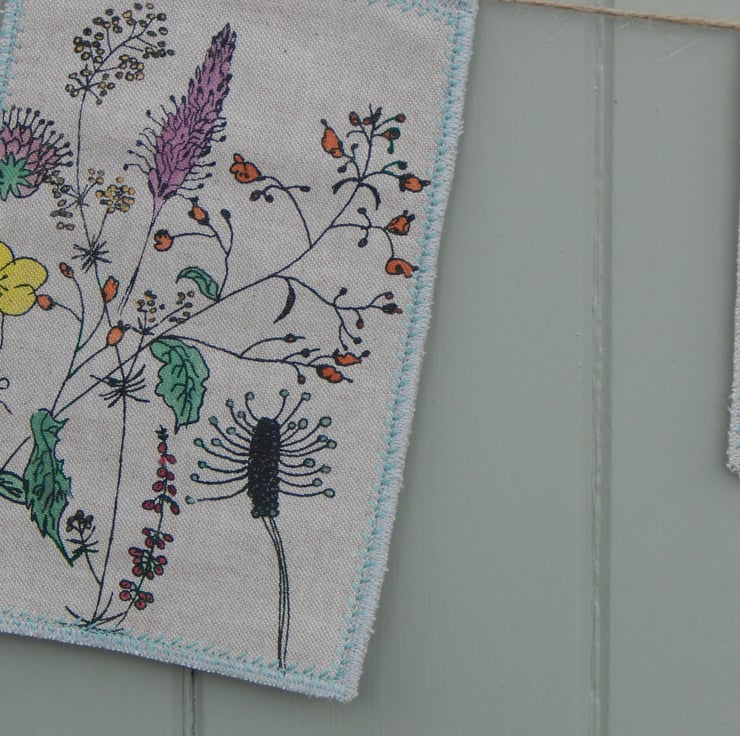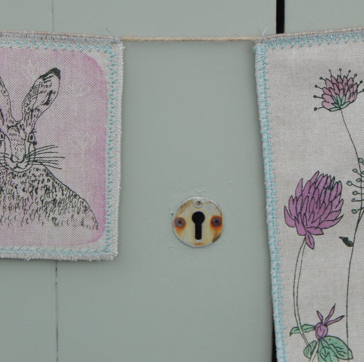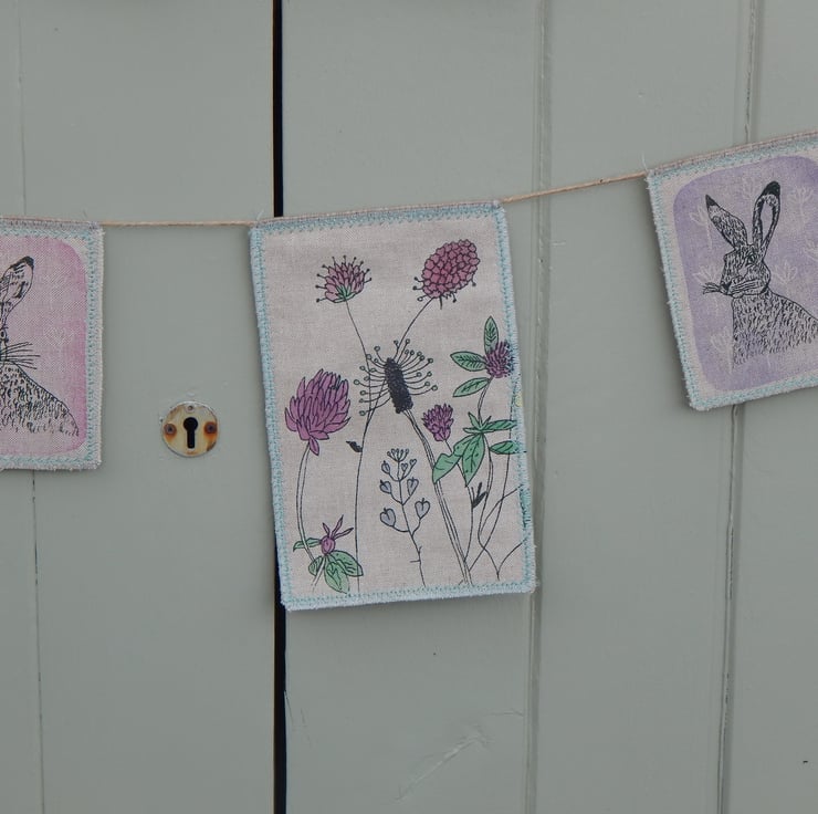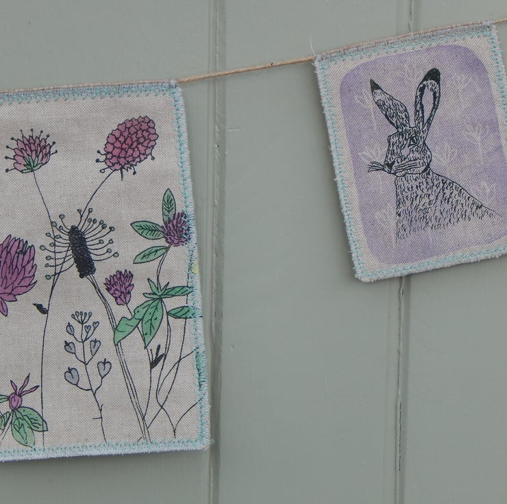 There are 3 panels with screen printed wild hedgerow flowers that have been hand painted with water colours to make them pop. There are plantain, dock leaf, red clover, buttercup, and shepherds purse. These panels measure approx. 22cm x 14cm. There are 2 hare designs and each have been printed onto a simple lino print. These measure 14cm by 11cm.