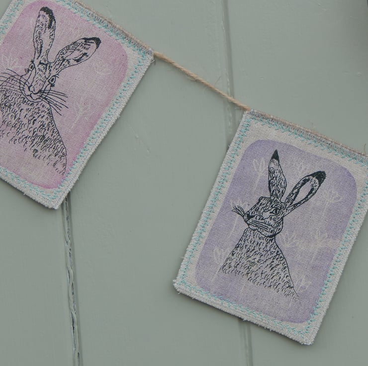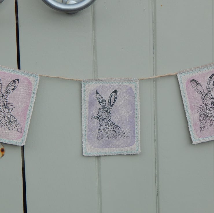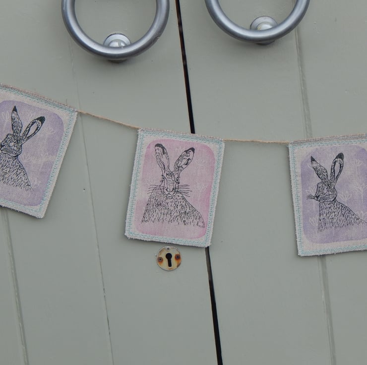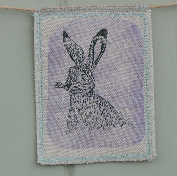 There are 5 panels with screen printed hares in 2 designs, these have been placed on top of simple pink or purple lino prints. They measure approx. 14 cm x 10cm. They have zig zag stitching to the edging to stop fraying then there is a lovely decorative green stitch on top to frame the hare.