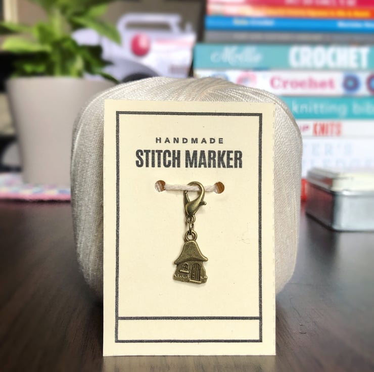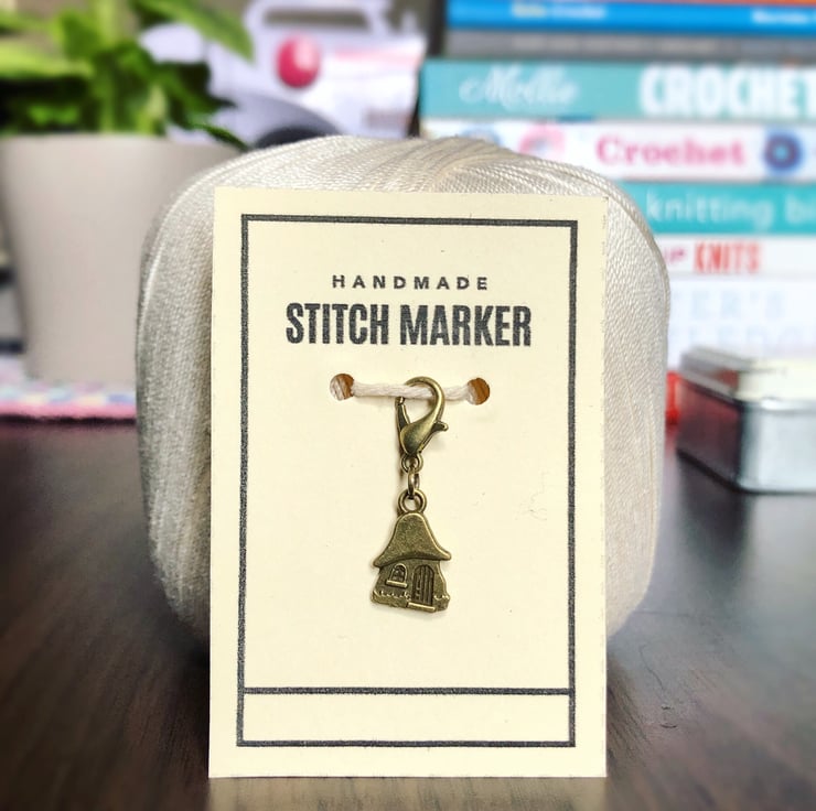 Small house stitch marker for knitting or crochet. Antique bronze finish, fitted with a lobster claw clasp.