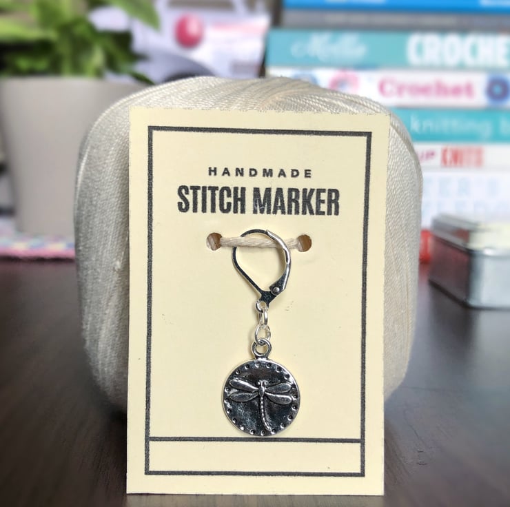 Dragonfly round stitch marker for knitting or crochet, with silver plated findings. You can choose either a lobster claw clasp (as in cover photo) or a larger lever back clasp (second photo) depending on your personal preference. The charm is very light weight.