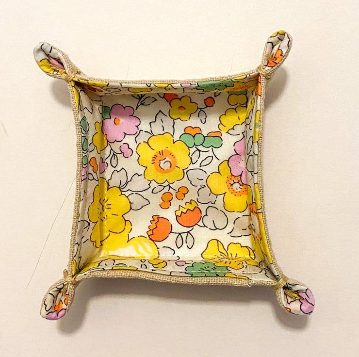 Pretty fabric storage tray made with Liberty tana lawn and natural linen fabric. Perfect for all of your bits and bobs such as hair accessories, sewing equipment, keys or loose change. These trays are also perfect to send as a letterbox gift.