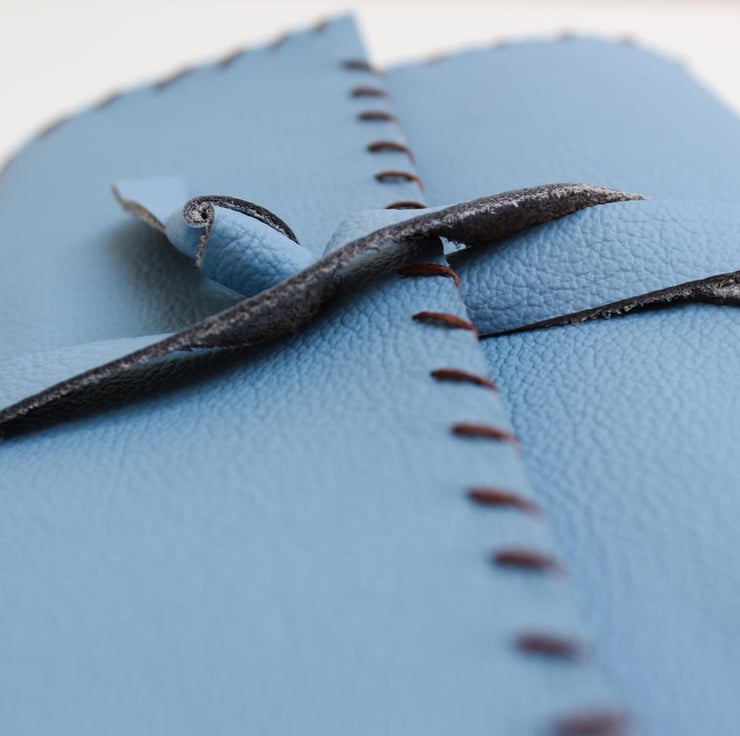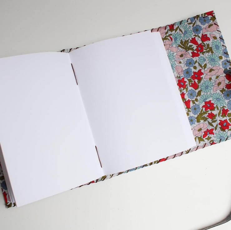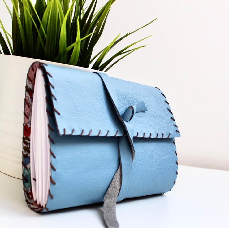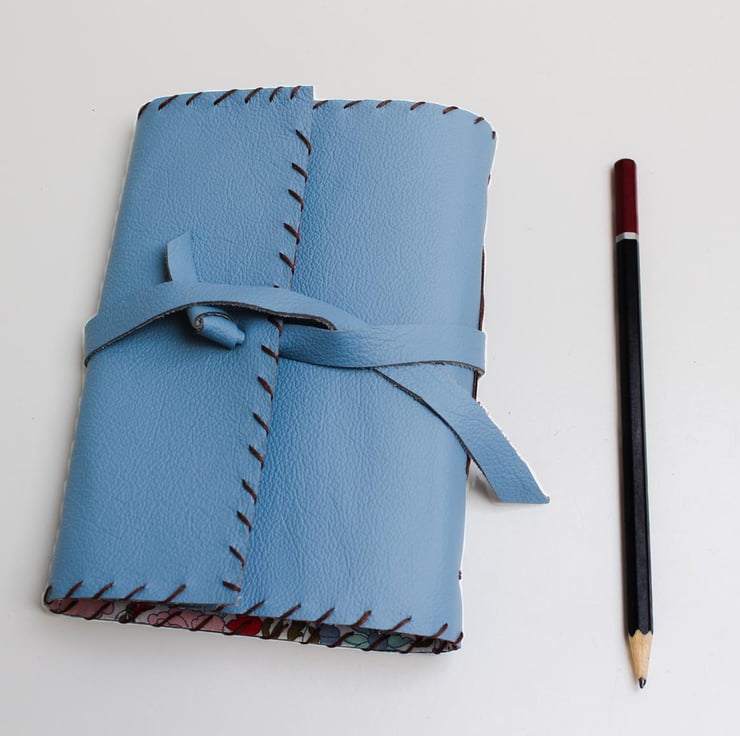 Gorgeous super soft light blue leather with a lovely Liberty floral material lining attached. The notebook is hand stitched around the edge and contains 200 blank sheets of plain white paper which are then hand stitched to the leather in 5 signatures. The notebook is fastened with the same leather tied loosely at the front.