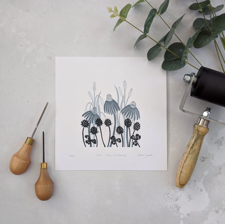 Meadow flower limited edition linocut print, titled Into the Meadows. Variable edition of 60.
