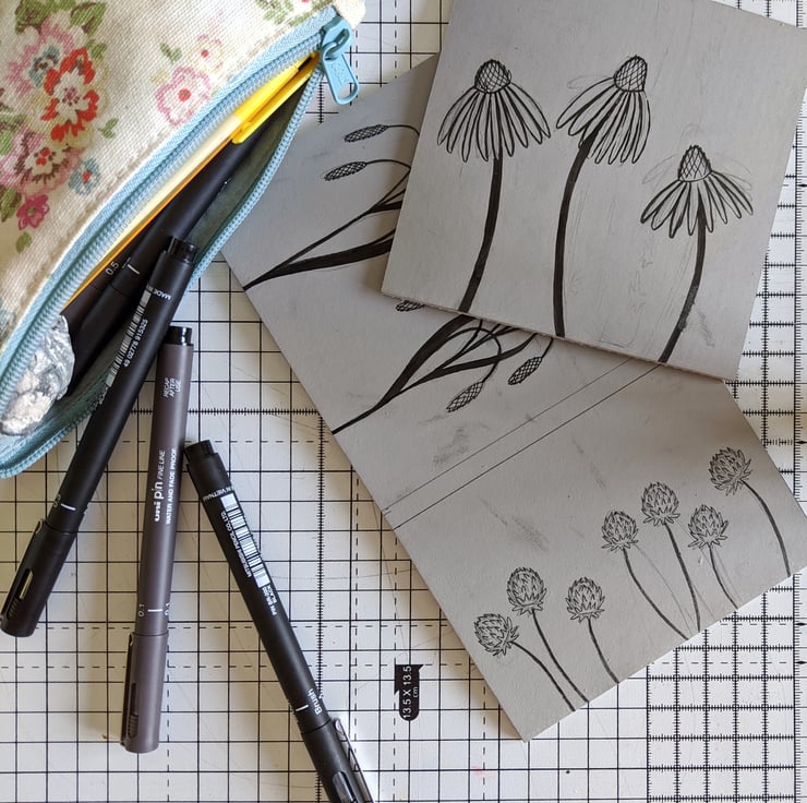 This print is response to the Covid 19 pandemic and the resulting lockdown period here in the UK. When we were allowed out to go for walks, we would often find ourselves exploring the river side or meadows nearby. The need to be near to nature was quite compelling and I feel that we were lucky to have such a wealth of nature right on our doorstep. I'd lag behind taking photos of whatever plants and flowers I found peeking out of the hedges and fields. The grass was long and the flowers were ever changing each time we'd go out.