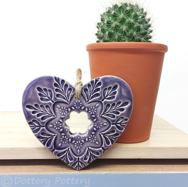 This listing is for a ceramic heart decoration. It is made from white earthenware clay, imprinted with pattern and finished with a bright, glossy glaze. It has been fired twice, once to the bisque stage and then a second firing for the glaze. It measures 7.5 centimetres wide and the same in height x 5mm thick. It can be hung outside.